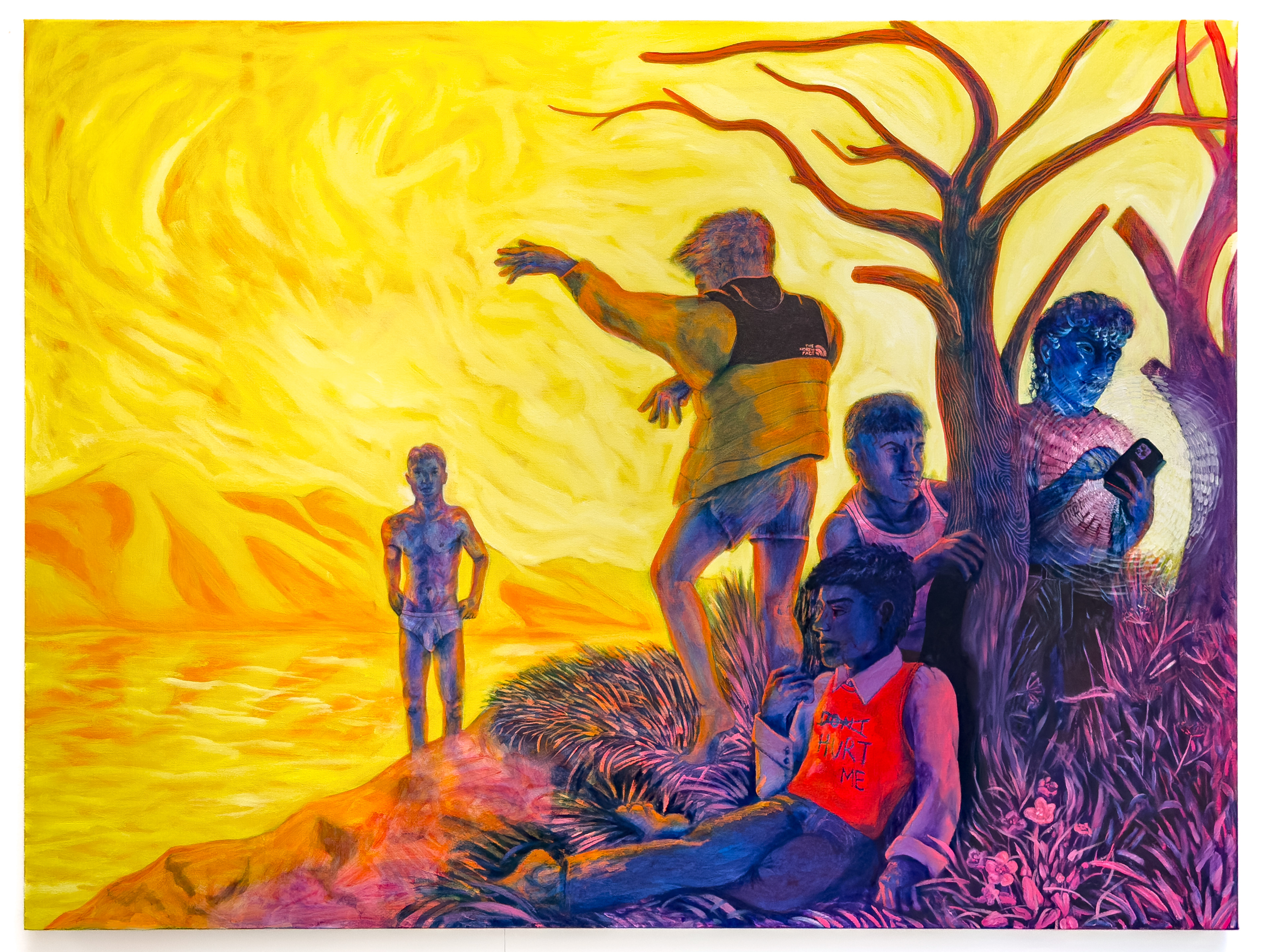 Oil pastel, coloured pencil, oil, and acrylic on linen