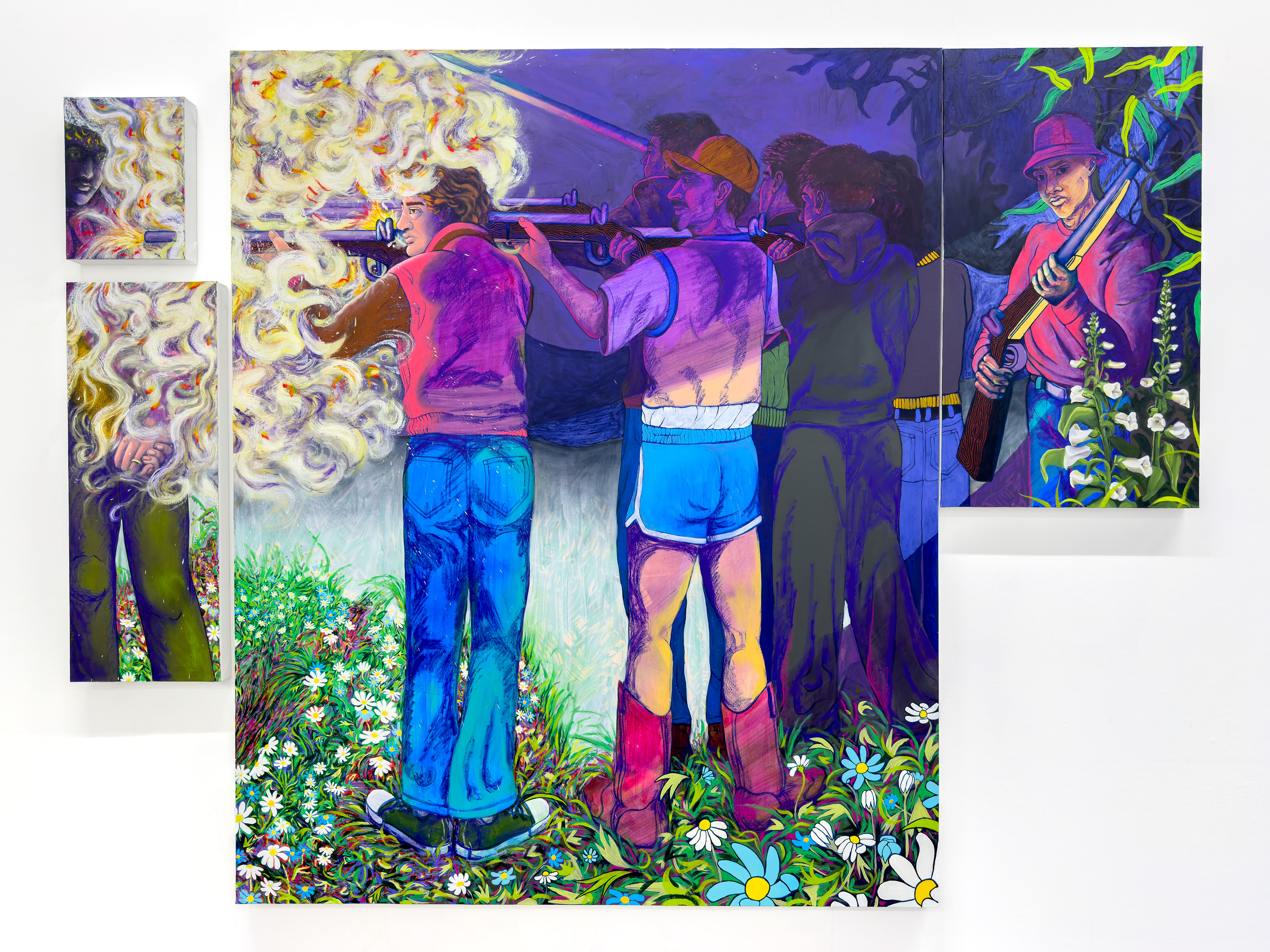 Oil, acrylic, oil pastel, oil stick, marker, and coloured pencil on canvases